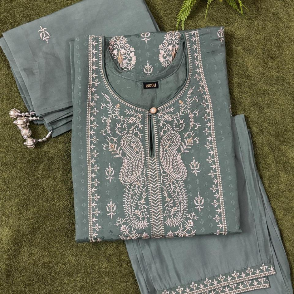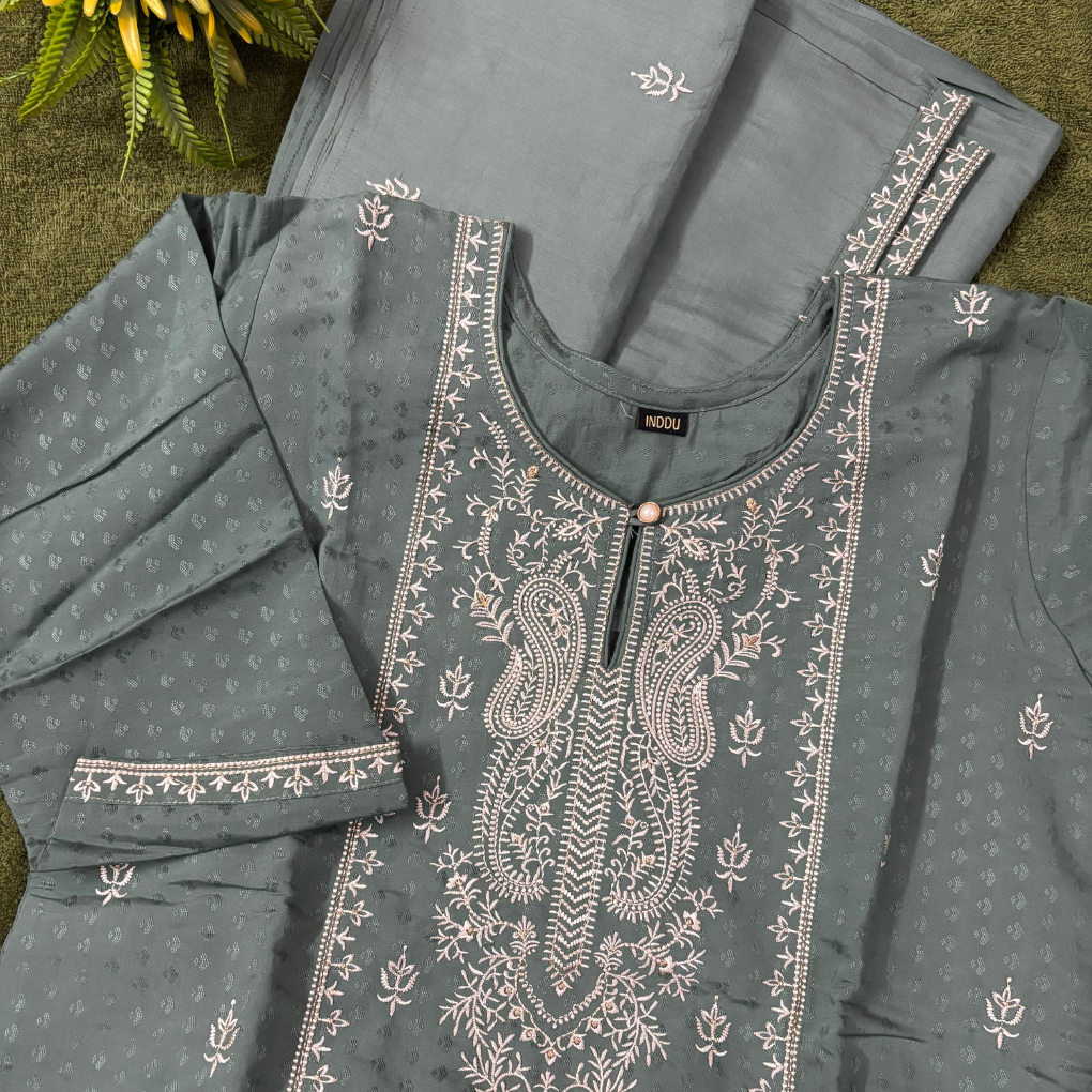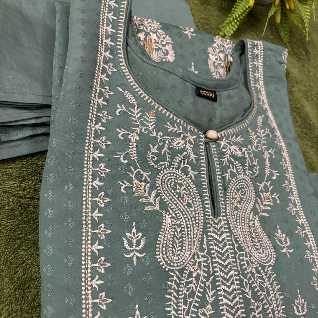 “Nazaakat” means grace and delicacy — just like the soft elegance you carries during festivals. This kurta set, in a soothing sage green shade, is beautifully embroidered with intricate white threadwork that feels like a garden of blossoms on fabric. The detailed patterns around the neckline and hem celebrate traditional artistry while keeping it light, airy, and comfortable for long festive days.